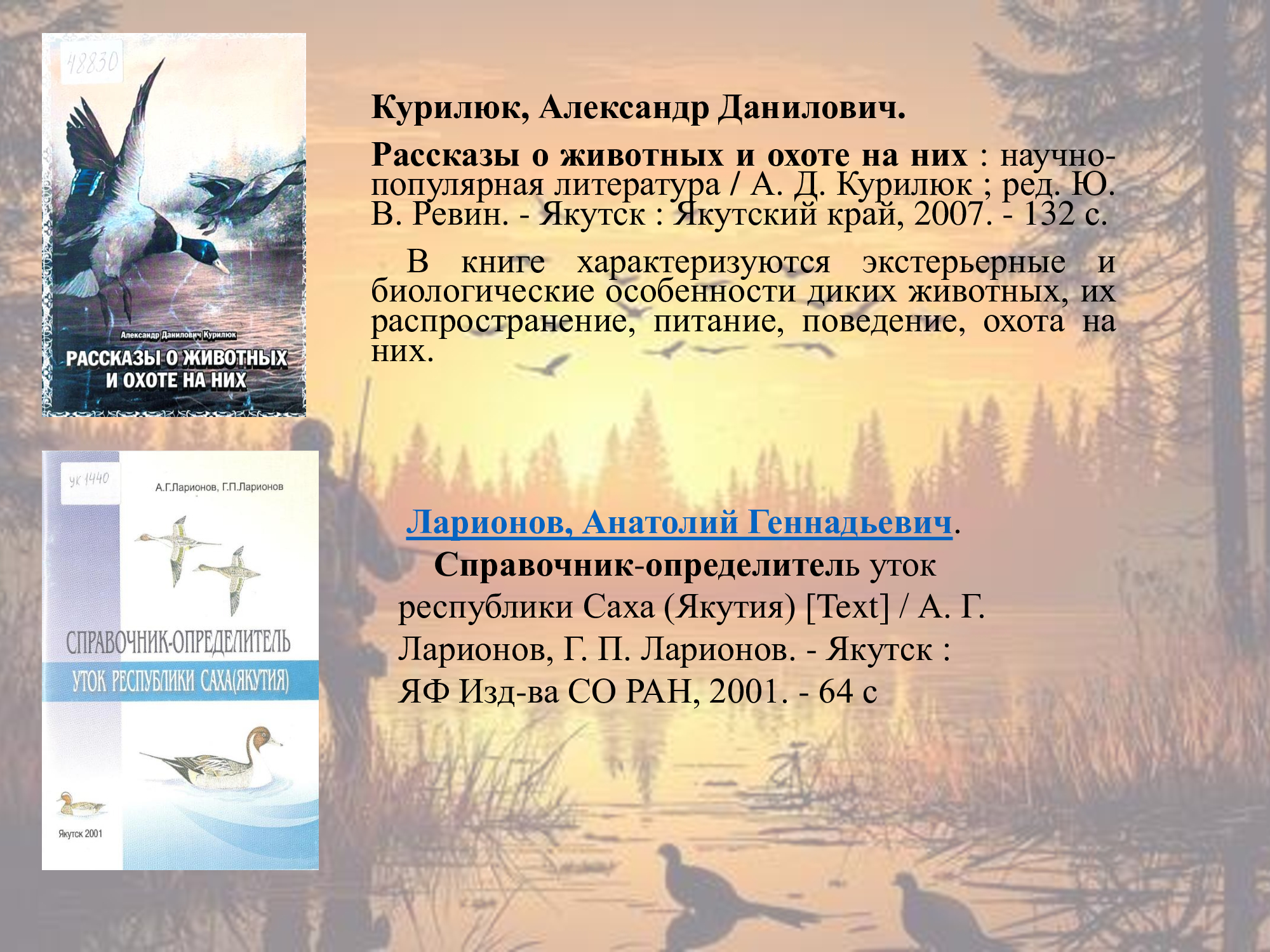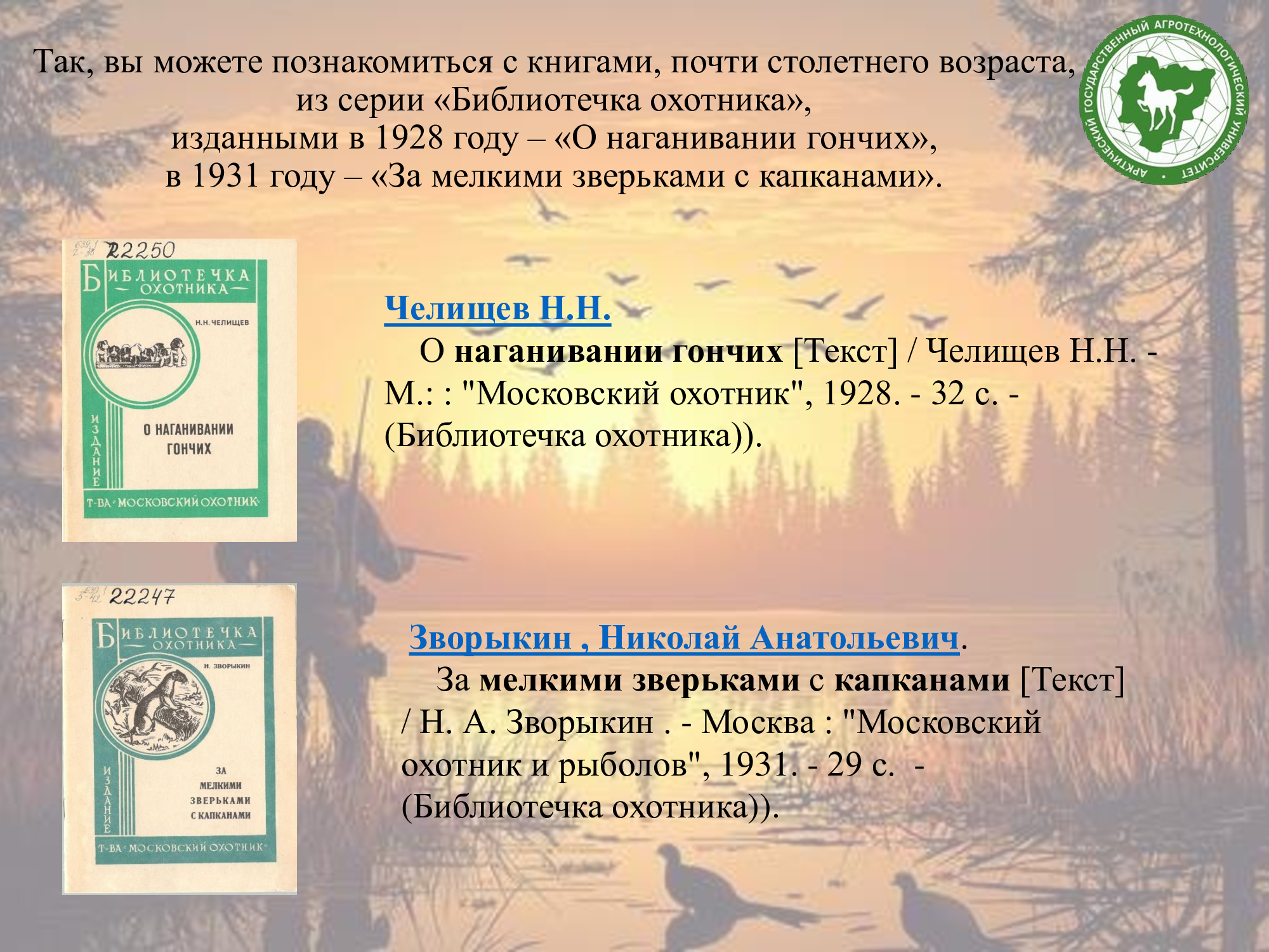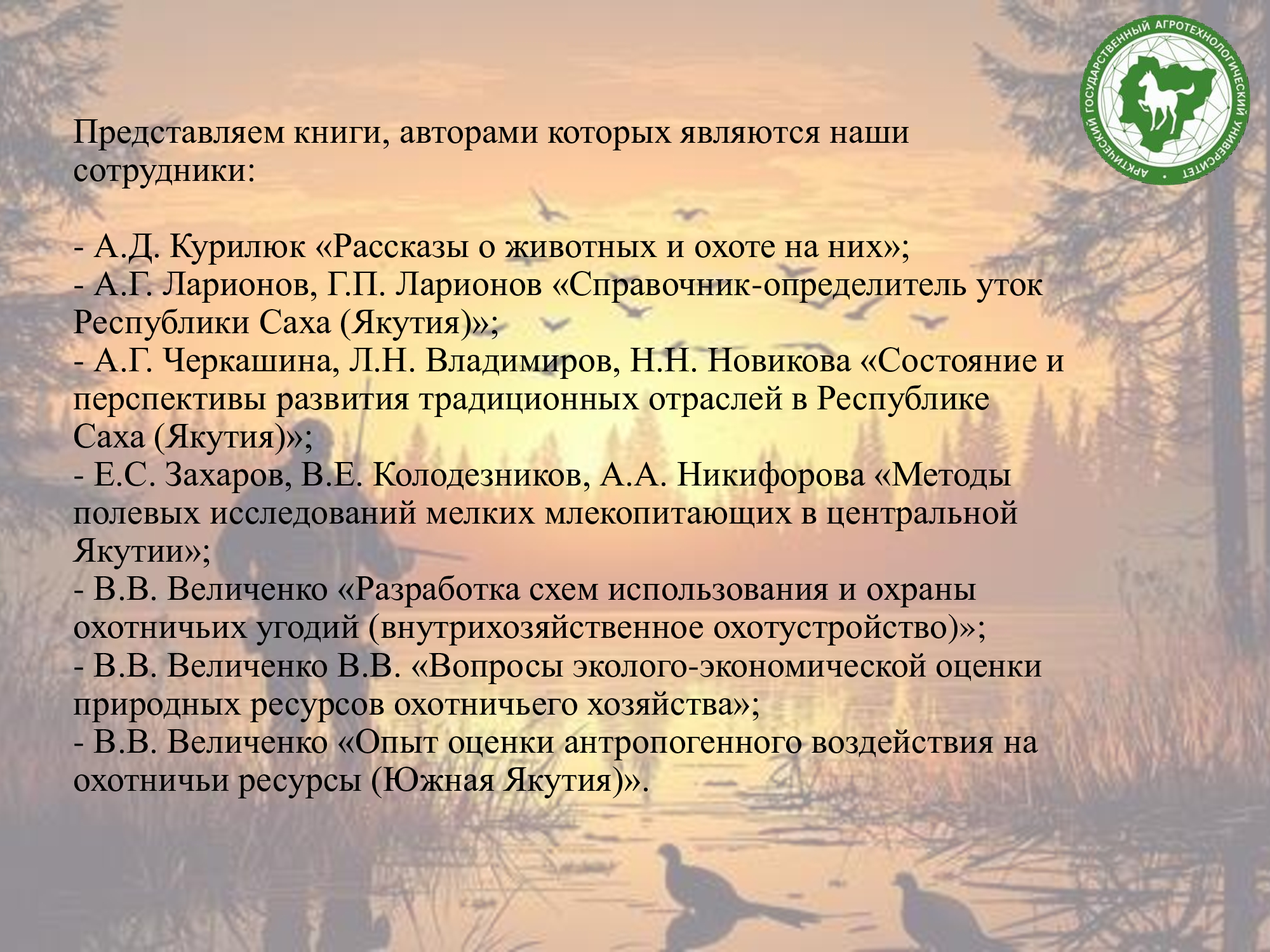 В фонде научной библиотеки имени К.Д. Уткина есть много книг, освещающих тему охоты, промысла, охотоведения, охотничьего собаководства, об особенностях птиц и зверей Якутии, охотничьих угодиях, о природных ресурсах, а также художественная литература.