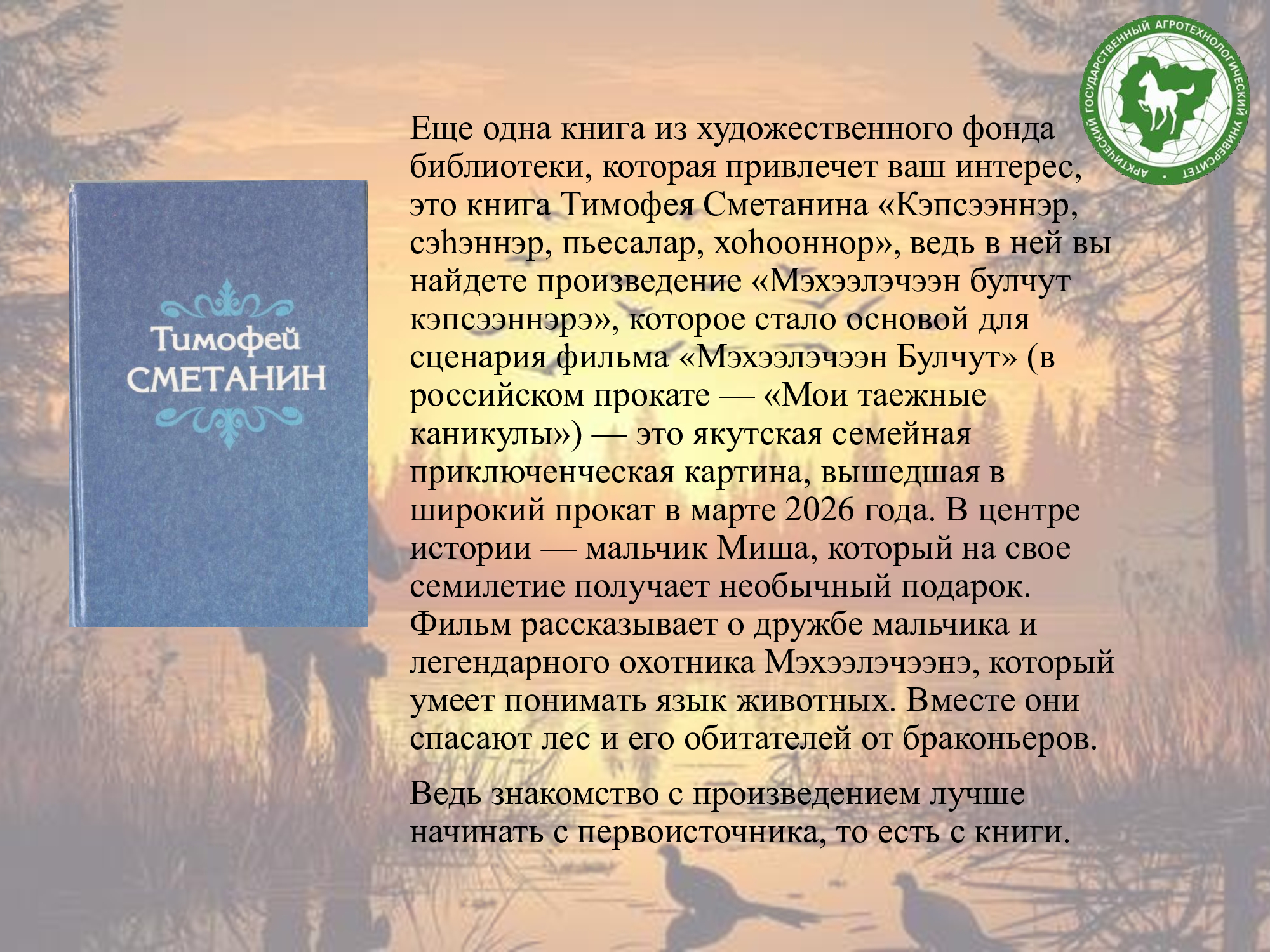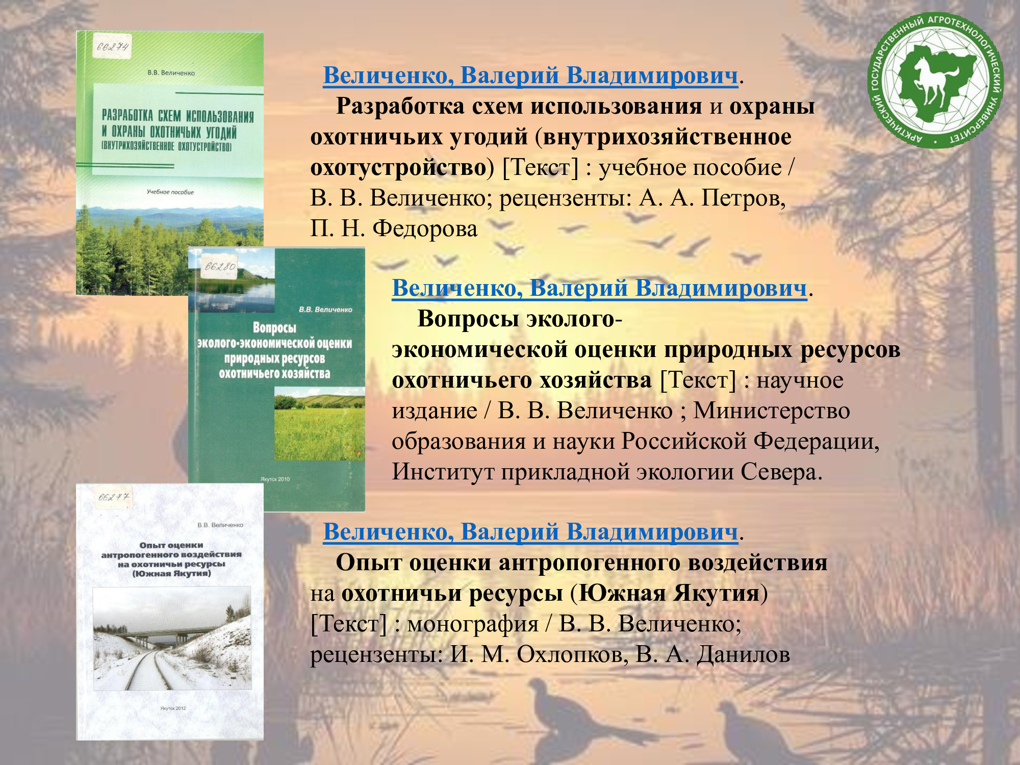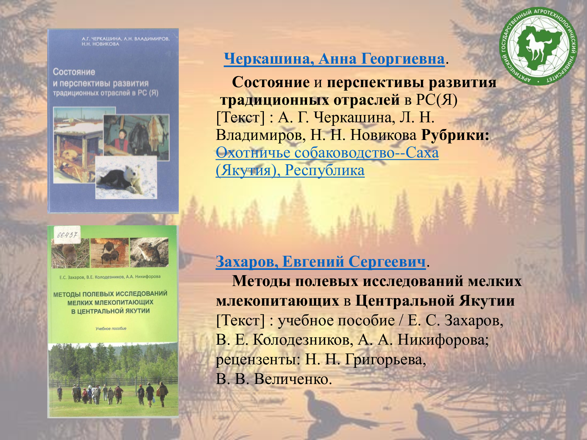 В фонде научной библиотеки имени К.Д. Уткина есть много книг, освещающих тему охоты, промысла, охотоведения, охотничьего собаководства, об особенностях птиц и зверей Якутии, охотничьих угодиях, о природных ресурсах, а также художественная литература.