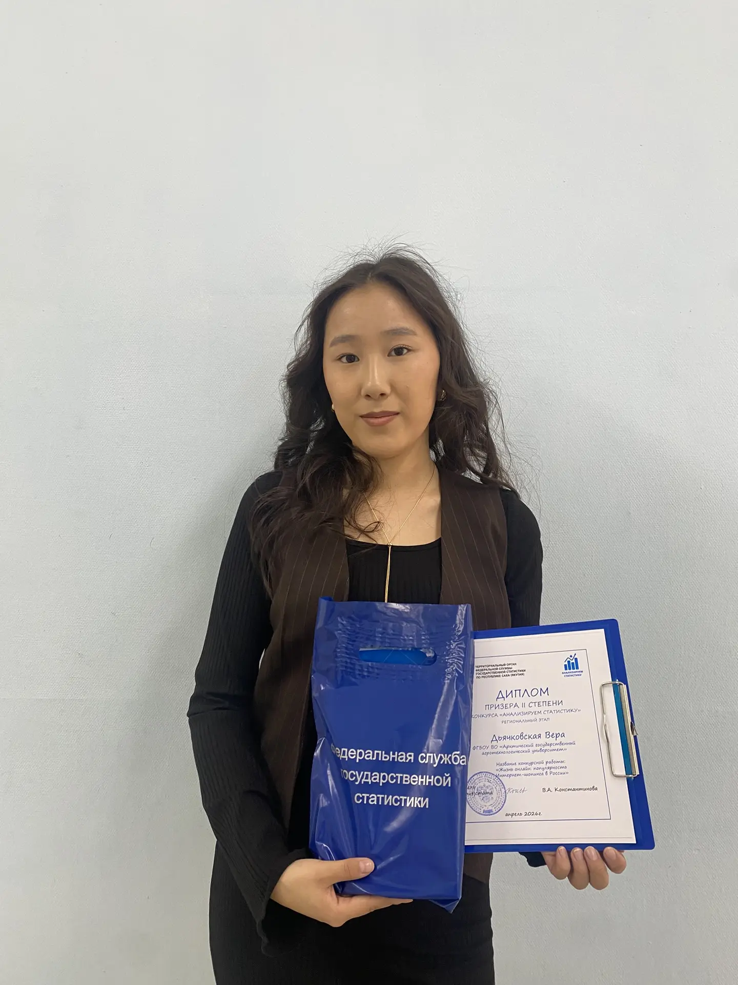 На церемонии награждения, прошедшей в рамках мероприятия «Университетская весна — 2026», победителям и призерам были вручены дипломы и памятные подарки. Награды вручала главный специалист-эксперт Территориального органа Федеральной службы государственной статистики по Якутии Инна Соловьева.